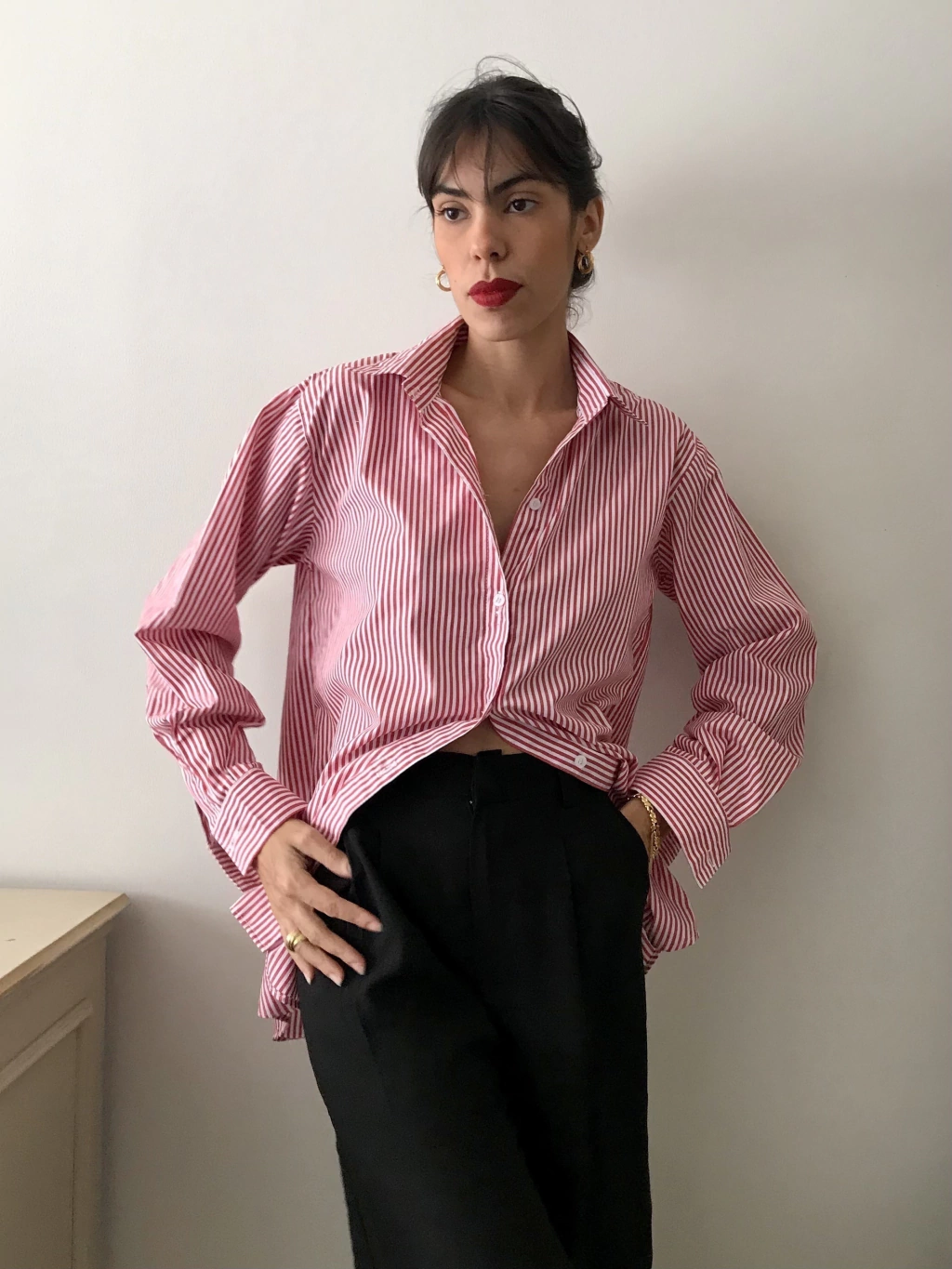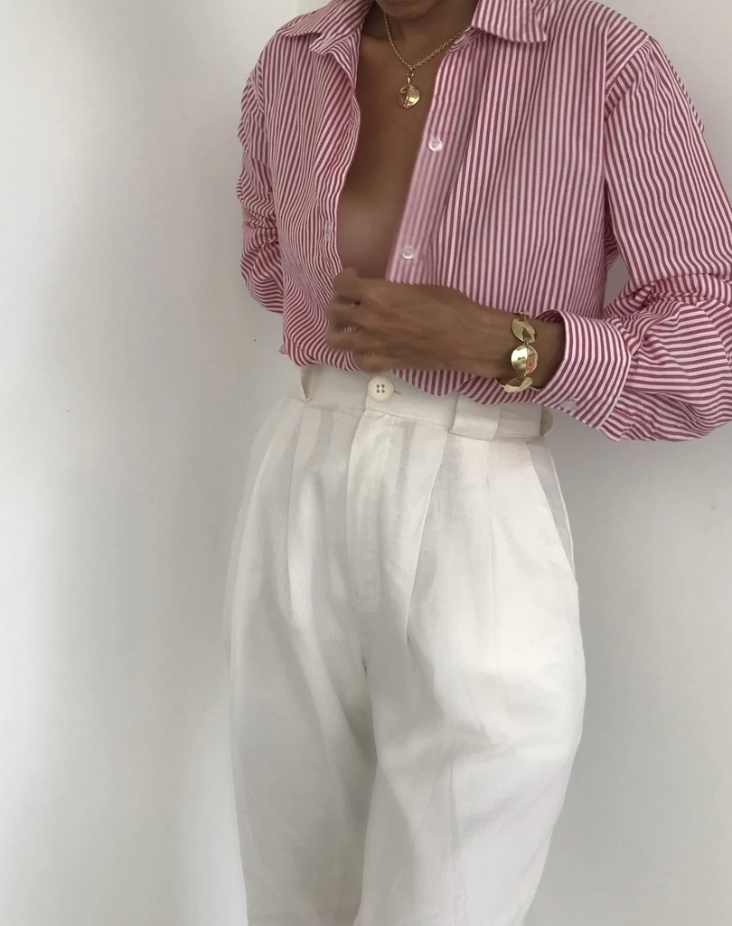 Camisa de alfaiataria clássica, produzida em algodão puro, com botões frontais e charmosas listras em vermelho e branco.
